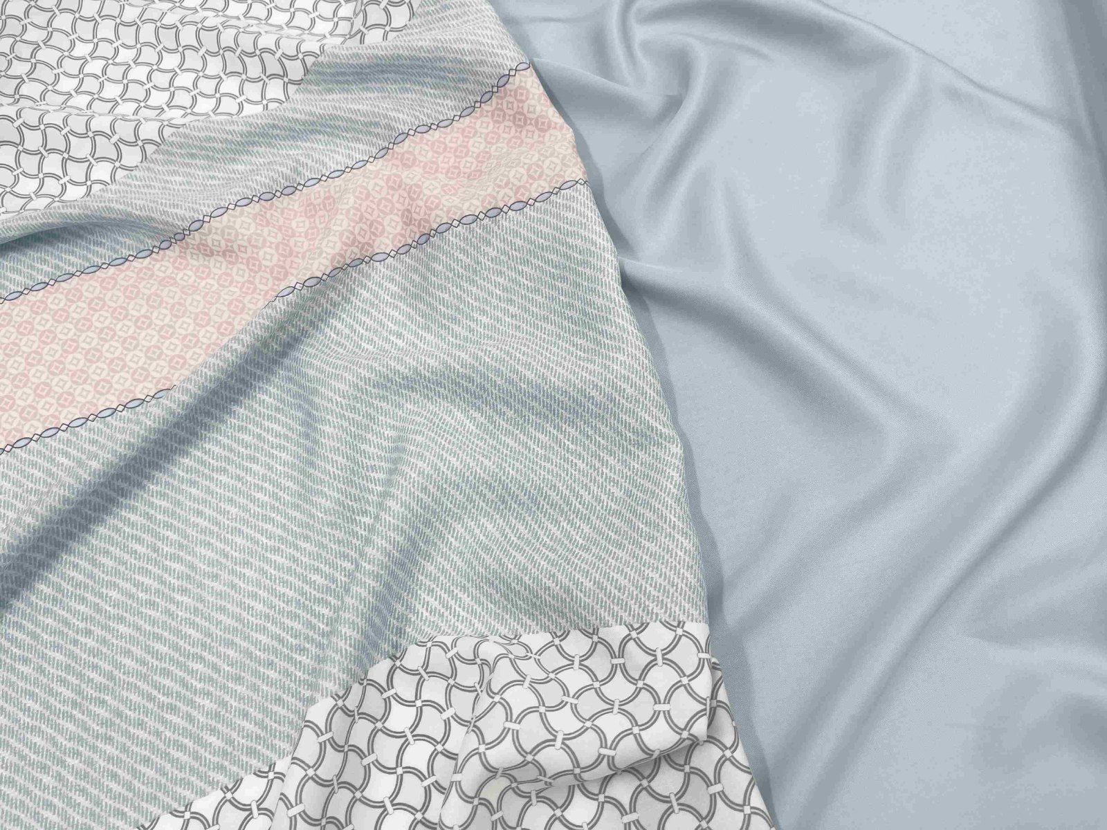 Геометрический орнамент дизайна Kelvin, выполненный в свежей кремово-голубой гамме, наполнит спальню энергией, создаст настроение на весь день.