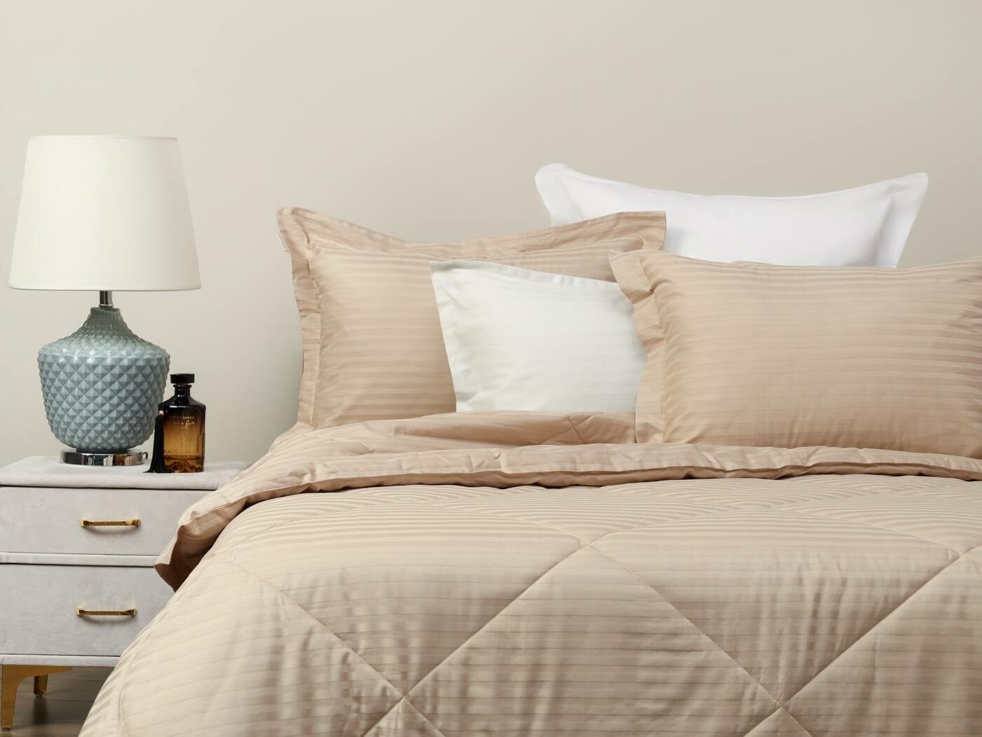 Это постельное белье с одеялом, которое не надо вставлять в пододеяльник. Комплект выполнен из качественной и натуральной хлопковой ткани. Эта ткань сочетает в себе мягкость и прочность, обеспечивая незабываемые ощущения во время сна. Жаккардовое плетение создает однотонный рисунок с элегантными чередующимися глянцевыми и матовыми полосками шириной 1 см, что привнесет вашему интерьеру изысканный вид. Такое плетение нитей придает долговечности ткани и потому используется в хороших отелях.