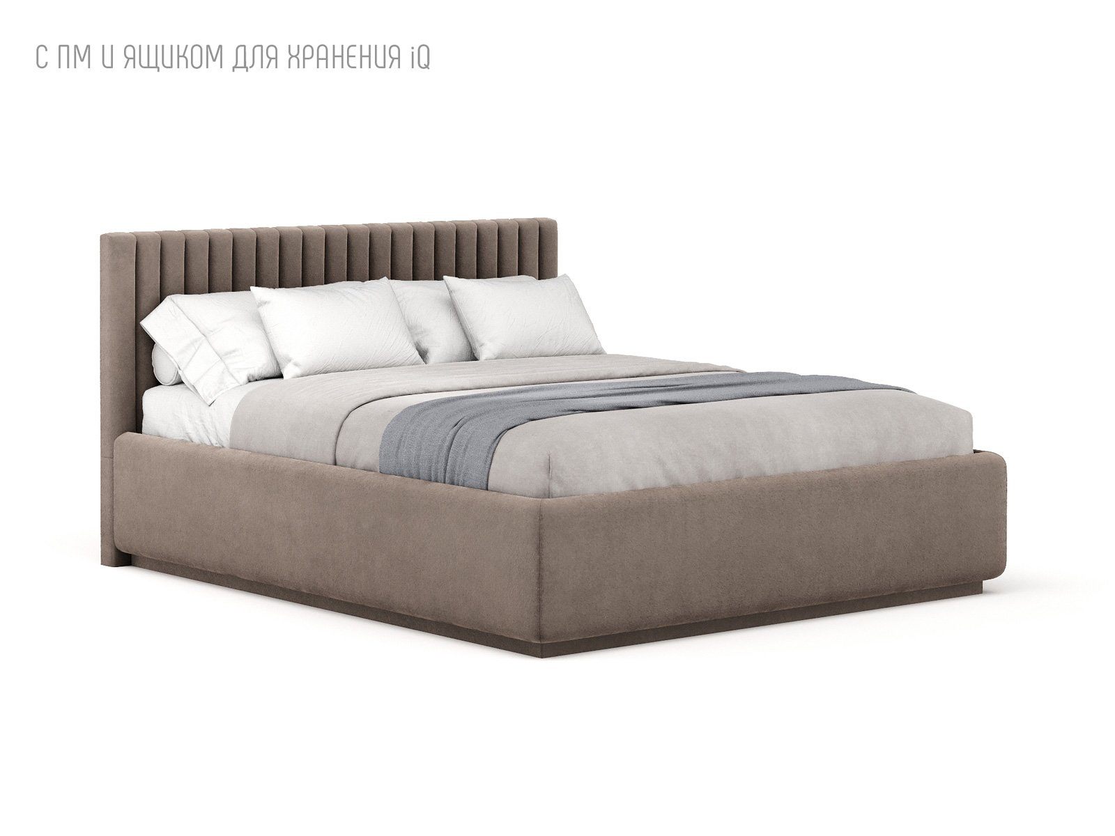 Кровать укомплектована IQ с подъемным механизмом и ящиком для белья без дна (дополнительная платная опция - дно к ящику IQ из HDF (ХДФ). Каркас кровати на цоколе, декоративный чехол на цоколе съёмный. Глубина ящика для белья - 30 см, без ограничения нагрузки на ящик.