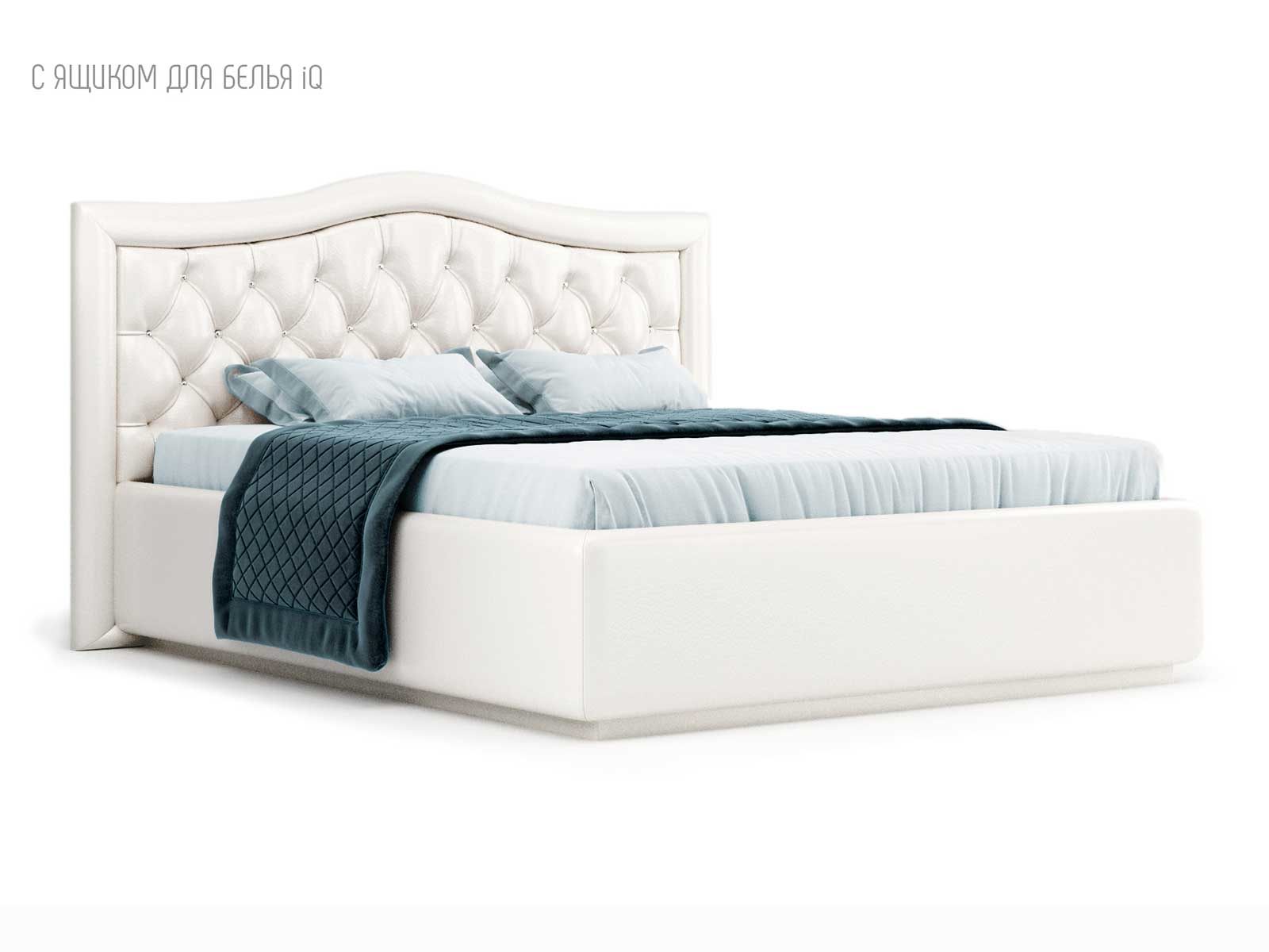 Кровать укомплектована IQ с подъемным механизмом и ящиком для белья без дна (дополнительная платная опция - дно к ящику IQ из HDF (ХДФ). Каркас кровати на цоколе, декоративный чехол на цоколе съёмный. Глубина ящика для белья - 30 см, без ограничения нагрузки на ящик.
