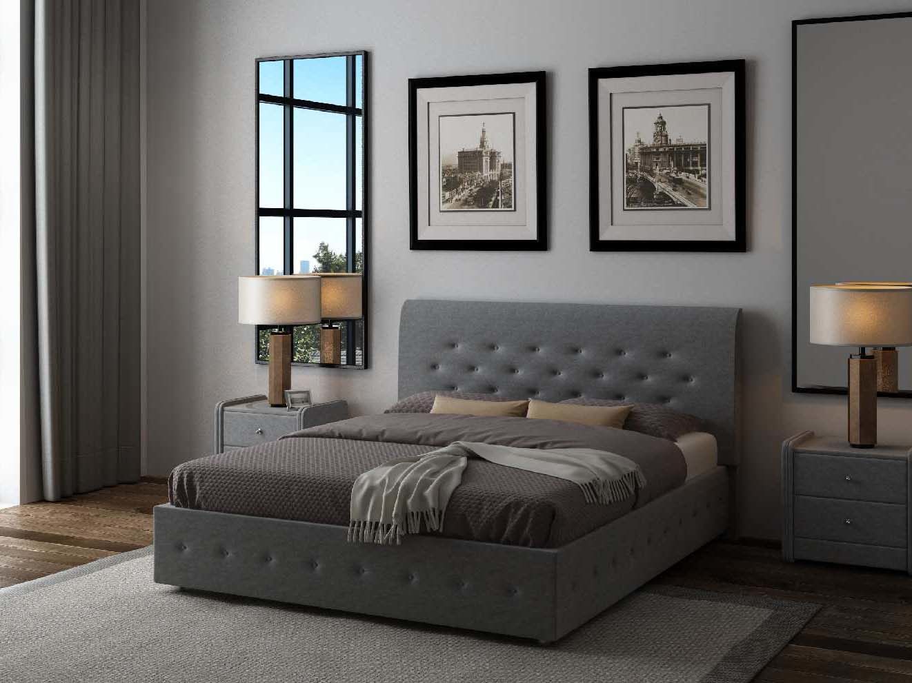 Кровать оснащена подъёмным механизмом. В такой вариации основание поднимается и открывает доступ к ящику для хранения белья и других вещей. Такая система может заменить небольшой шкаф и решить вопрос с организацией пространства.
