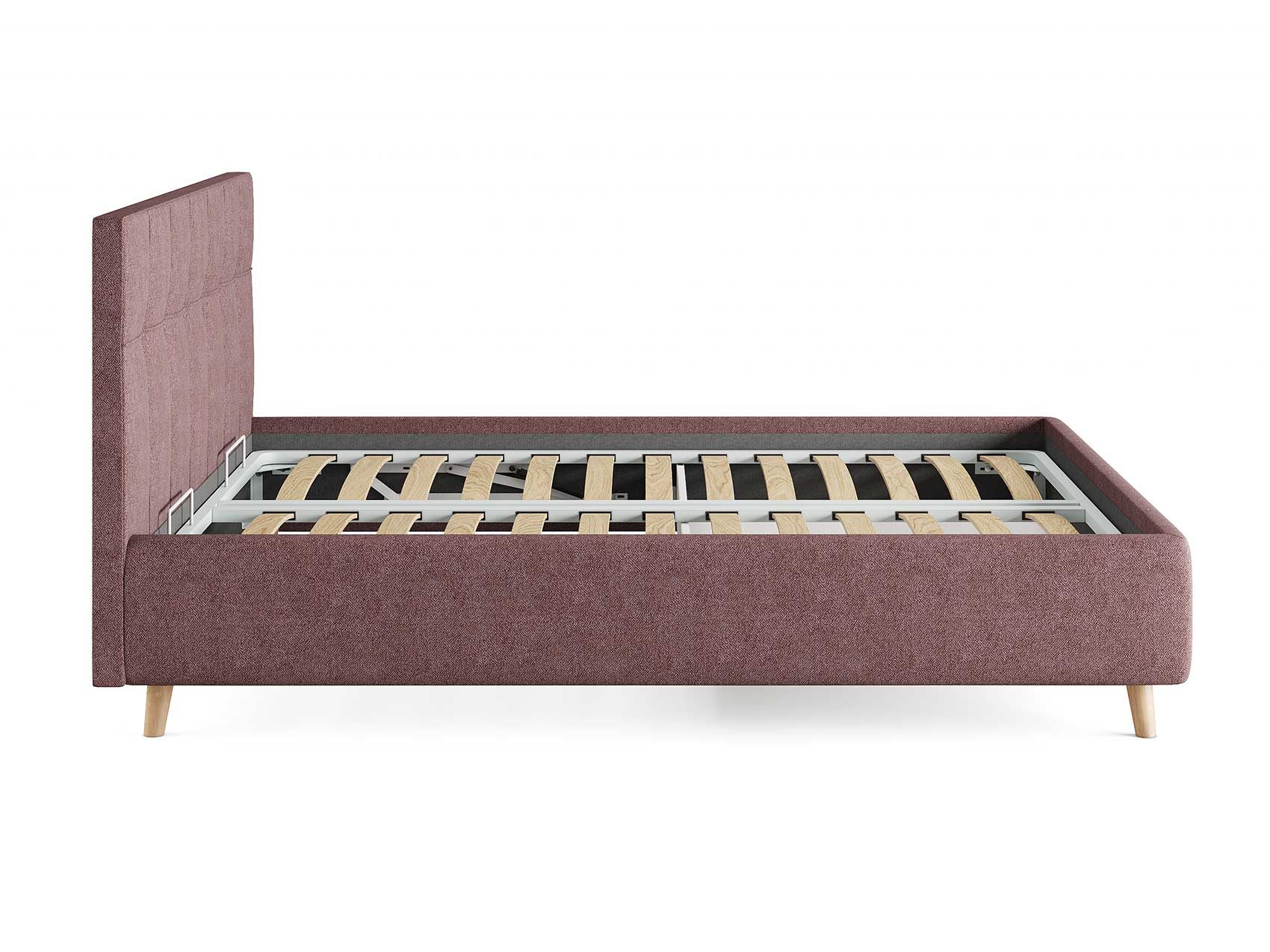 Двуспальная кровать с мягким изголовьем подойдет для современных интерьеров спален, а благодаря высоким деревянным ножкам впишется в стиль ретро, скандинавский или минимализм.