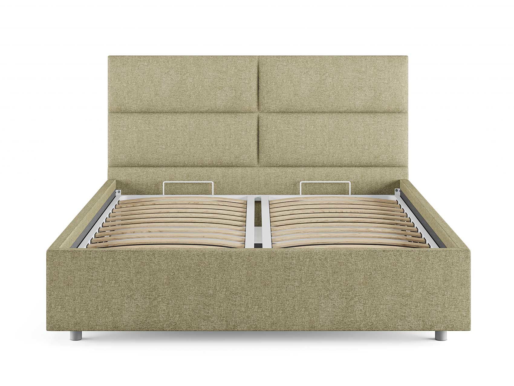 Кровать комплектуется металлическим основанием (без опор), которое имеет 13 рядов встроенных березовых ламелий на каждое спальное место, обеспечивая равномерное распределение нагрузки.