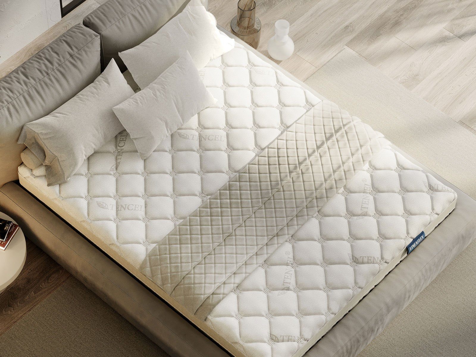 Обивка матраса пошита из натуральной трикотажной ткани Tencel. Материал получают из волокна на основе эвкалиптовой целлюлозы. Эфирное масло эвкалипта хорошо известно своими бактерицидными свойствами, поэтому полотно естественным образом обретает антибактериальный эффект. Тенсель отличается шелковистой текстурой и нежным финишем благодаря чему очень комфортен при соприкосновении с кожей.