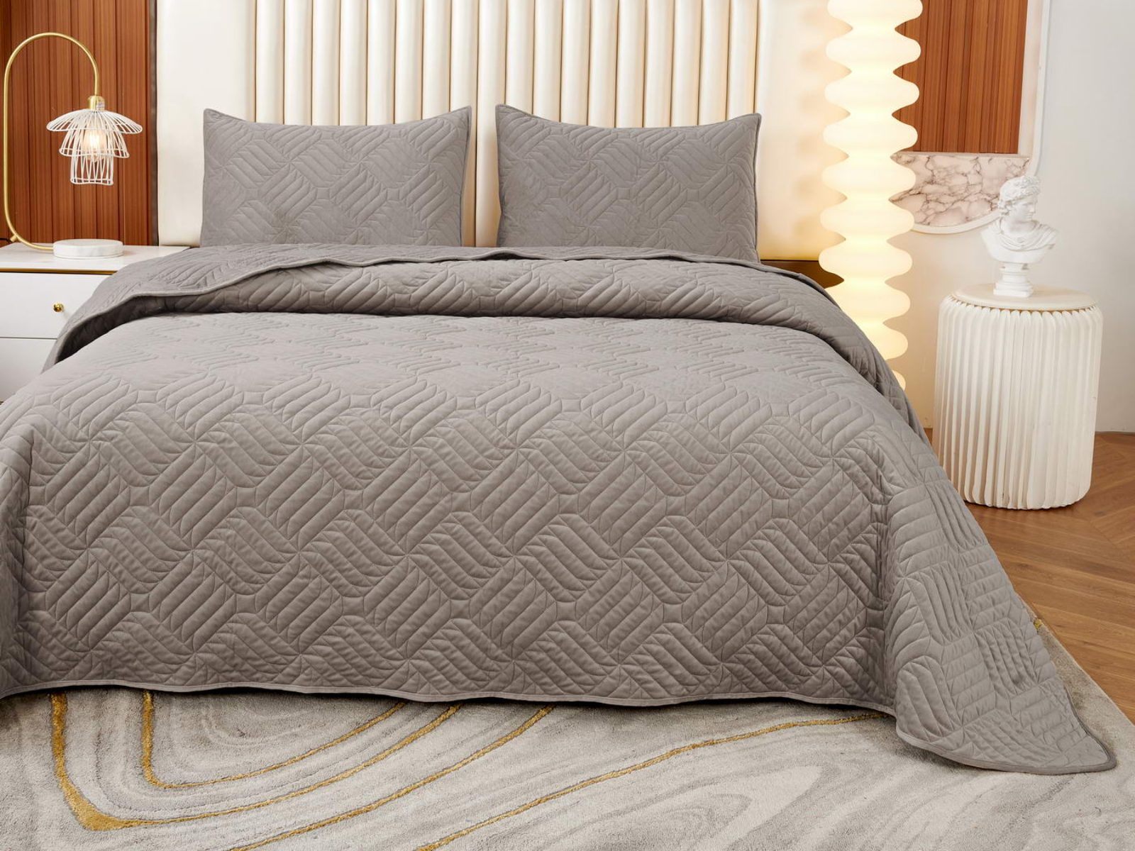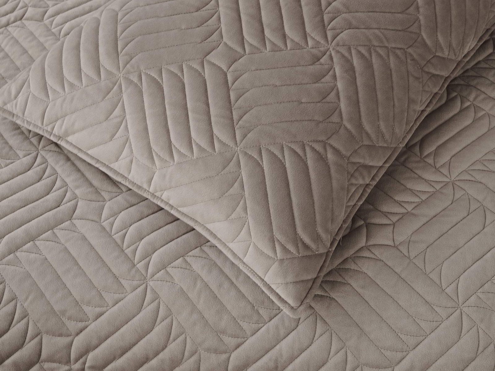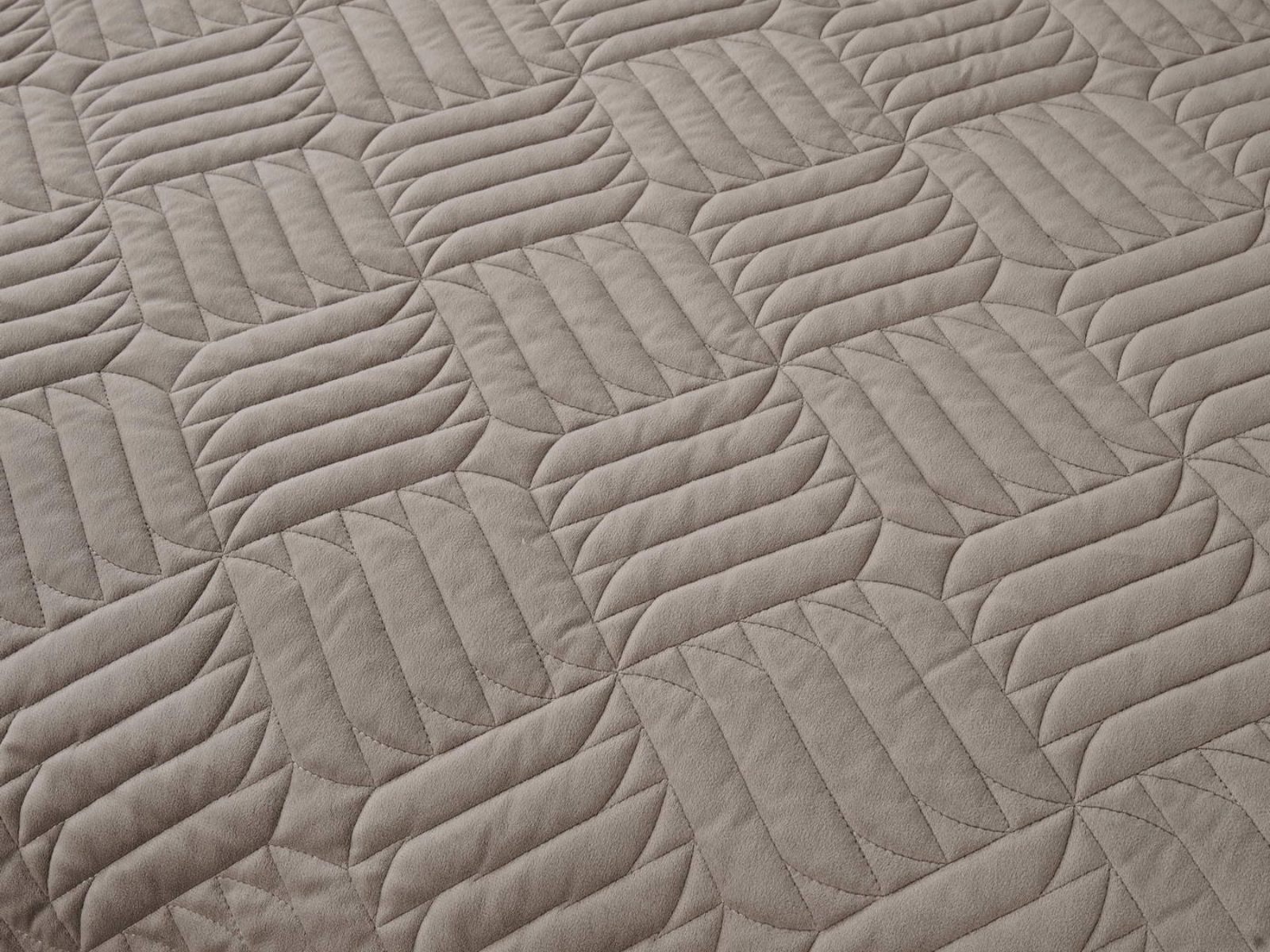 Покрывала выполнены в 10 оттенках: крем, мокко, пепельный, песочный, светло-бежевый, светло-серый, серый, темно-серый, чайная роза и черный. Стежка в виде геометрического орнамента подойдет к любому современному интерьеру. Из-за особого плетения, велюровая ткань покрывала отражает свет и красиво переливается при различном освещении.