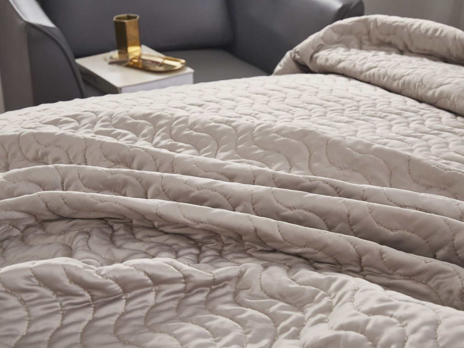 Коллекцию характеризуют сдержанные цвета с широкой палитрой сочетаний: серый, стоун, пудра, кофе, лаконичный волнистый узор, выступающий над поверхностью ткани, объёмная фактура, мягкость и гладкость атласного материала, деликатный кант по периметру изделия.